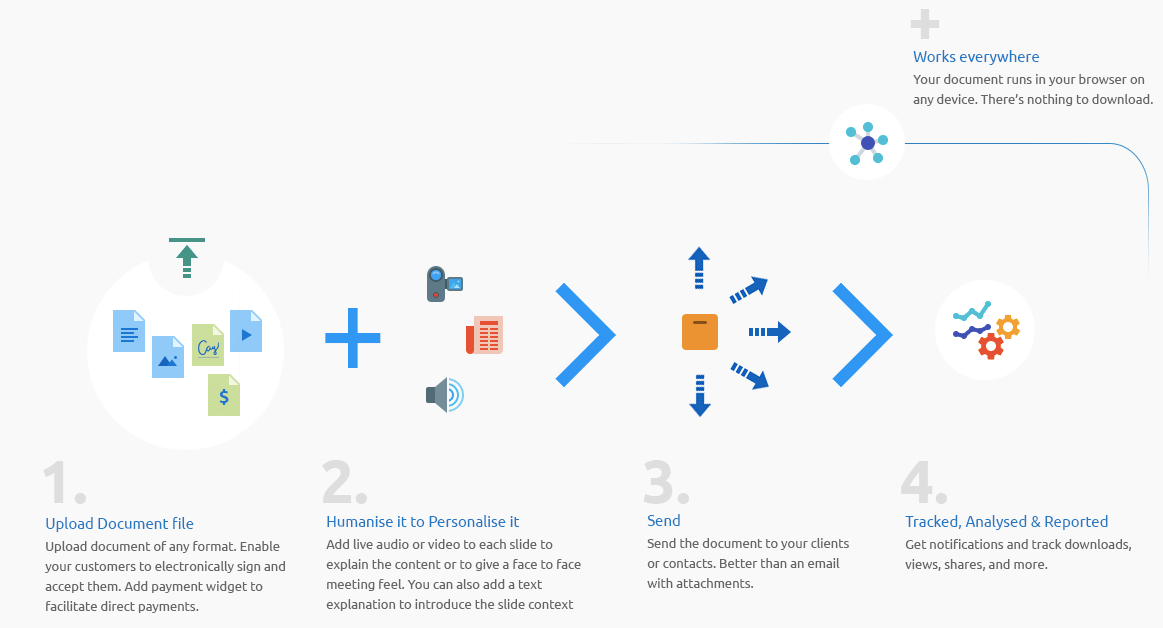 Stop sending dead, lifeless documents. Humanize it with your live Video or audio or even text narration on each page to explain finer points of the proposals. Impress your clients with a different proposal viewing experience and make your proposal to really stand out from the crowd.